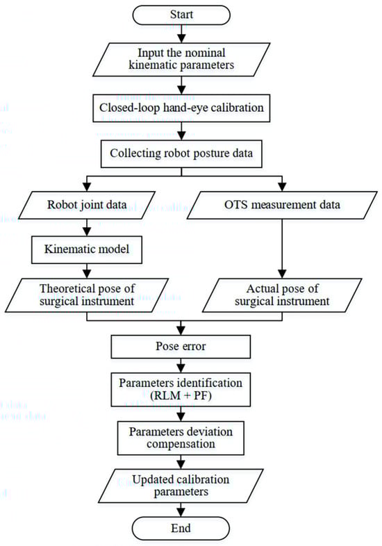The RAPP system integrates cutting-edge visual tracking, 3D reconstruction, and motion control technology, enabling precise manipulation of surgical instruments and enhancing the accuracy of percutaneous puncture operations. Due to its outstanding positioning accuracy and motion stability, the RAPP system has gained popularity in medical interventions, specifically, in neurosurgery and orthopedics [,,]. A typical RAPP configuration includes medical imaging equipment, a multi-degree-of-freedom serial robotic arm equipped with surgical instruments, an external measurement device, and a system control center. External measuring devices allow real-time tracking of surgical instruments and the patient’s body, assisting the doctor in determining the appropriate puncture location. The robotic arm, supervised by the system control center, is tasked with transporting the surgical instrument to the designated target puncture location. Obviously, the accuracy of the puncture surgery depends on the precision of the RAPP system. Puncture errors while using the RAPP system can be attributed to two factors: errors in robot kinematic parameters and hand–eye calibration. Within these factors, errors in kinematic parameters primarily stem from manufacturing and assembly tolerances, wear and deformation of the robot’s structure, and geometric irregularities of the robot (e.g., orthogonality and parallelism). These errors can lead to absolute positioning errors and trajectory-planning deviations of the robotic arm, affecting the subsequent accuracy of the RAPP system’s target positioning. Research has proven that errors in kinematic parameters are the primary cause of positioning errors []. Additionally, the hand–eye calibration determines the homogeneous transformation matrix between the robot and the external measurement device, as well as between the surgical instrument and the robot flange. Inaccuracies in hand–eye calibration can result in inconsistencies between the actual and observed positions of surgical instruments, which can then lead to errors in the RAPP system. Therefore, precise calibration of the robot’s kinematic parameters and a hand–eye calibration before surgery are crucial.