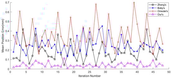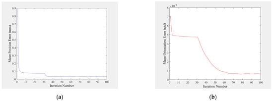 (a) The mean position error in the iteration process; (b) the mean orientation error in the iteration process.