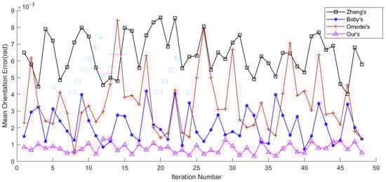 To further validate the effectiveness and superiority of the proposed system calibration method, we conducted comparative experiments using Zheng’s method [], Boby’s method [], and the most effective method confirmed in Omodei’s study []. These methods were employed to calibrate the RAPP system, and the position and orientation errors of 48 validation samples were calculated. Subsequently, the results were compared using the calibration method proposed in this paper. The comparison results, as presented in Figure 5 and Figure 6, clearly demonstrate that our proposed method outperforms the other comparative methods in terms of both position and orientation errors. The main reason for these larger errors in other methods is that they can only calibrate error sources in a specific aspect of the RAPP system and lack the capability to simultaneously eliminate positioning errors caused by robot kinematic parameters and hand–eye calibration. Table 5 presents the maximum, minimum, and average values of the position and orientation errors. After calibration using Zheng’s, Boby’s, and Omodei’s methods, the position errors were measured at 0.1788 mm, 0.2556 mm, and 0.3572 mm, while the orientation errors were determined to be 0.0064 rad, 0.0021 rad, and 0.0035 rad, respectively. By contrast, when employing the proposed calibration method algorithm for the RAPP system, the most significant improvement is observed in positioning accuracy, with the positioning error and orientation error reduced to 0.0418 mm and 0.0007 rad, respectively. The experimental results clearly demonstrate that the proposed system calibration method greatly enhances the absolute positioning accuracy of the RAPP system.