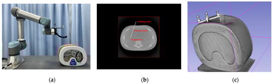 Robotic puncture on biomimetic model: (a) experimental scene diagram; (b) planning puncture path; (c) 3D image of biomimetic model after puncture.