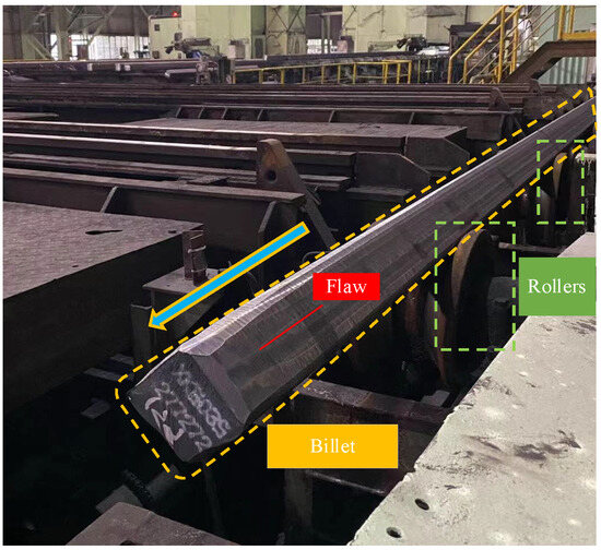 Figure 1 presents an illustration of a billet. Typically, the flaws manifest as straight lines parallel to the direction of forward movement, with lengths ranging from 50 mm to 500 mm. The spacing between roller tables is approximately 2 m. Billets on this line measure between 13 m to 15 m in length and operate at a speed of 0.2 m/s. Due to the manufacturing methodology, flaws exclusively appear on the two inclined planes at the upper part of the billet. A section of roughly 8 m is designated for magnetic particle cleaning.