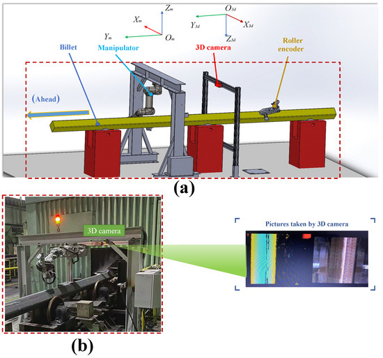 Acquisition of a point cloud image by the 3D camera ranges between 500 ms and 1000 ms, while the vision algorithms of the proposed system require approximately 800 ms. As a result, a specific installation gap between the 3D camera and the manipulator’s marking position is necessary. Our design incorporates a 1.8 m interval between them. Given the billet’s running speed of 0.2 m/s, this setup satisfies the system’s requirements.