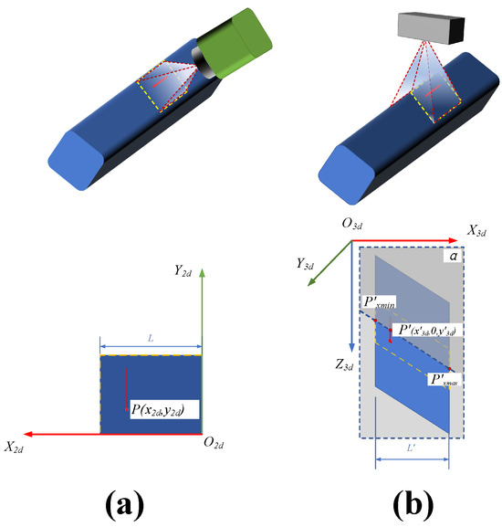 The method for a flaw’s position in one 2D camera converting to that in the 3D camera. In (a), the upper image represents taking Camera B as an example, and the lower image is a schematic of the corresponding image including the coordinate system; in (b), the upper image shows a schematic of the 3D camera’s capture, and the lower image is a point cloud schematic of Surface B including the coordinate system.