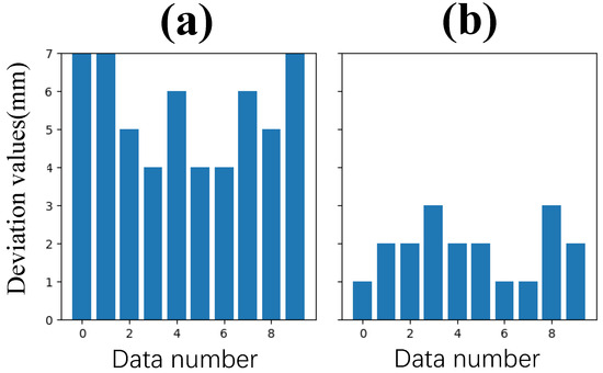 The chart depicts the deviation values of 10 trials for both the initial and improved experiments as the result. (a) Initial experiments. (b) Improved experiments. It suggests that our method yields more precise and stable results.