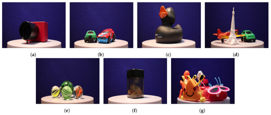 View samples of the light field dataset: (a) Camera, (b) Cars, (c) Duck, (d) Eiffel, (e) Marbles, (f) Sharpener, and (g) Toys.