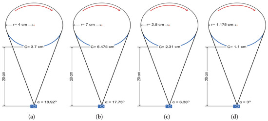 The FOV of the camera (‘’) and the covered circumference (‘C’) for each content: (a) Camera and Duck, (b) Toys, (c) Cars, Marbles, and Eiffel, and (d) Sharpener.