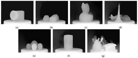 The depth maps of the view samples of the light field dataset: (a) Camera, (b) Cars, (c) Duck, (d) Eiffel, (e) Marbles, (f) Sharpener, and (g) Toys.