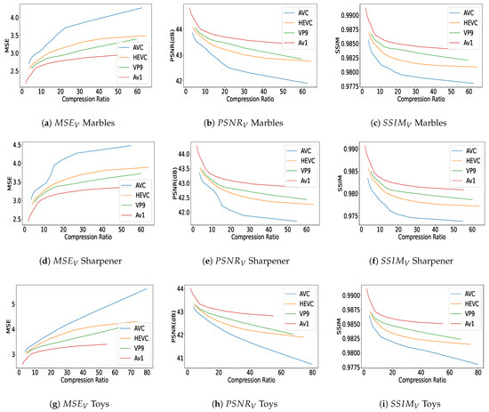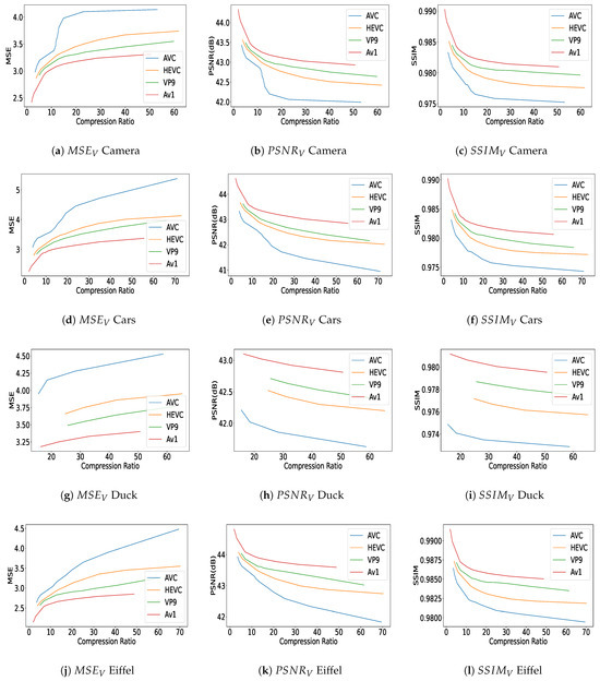 Following compression, the quality of the impaired contents is assessed by using three quality assessment metrics: , , and , where V—similarly to , , and —refers to “views”. As the objective is to assess the quality of the degraded contents, these metrics calculate the mean of , , and , respectively, over the different views.