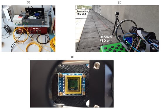 The unit for active stabilization of Doppler shifts in the optical fiber path, and beat-note measurement unit with a spectral analyzer and FSO testbed is shown in Figure 2a,b.