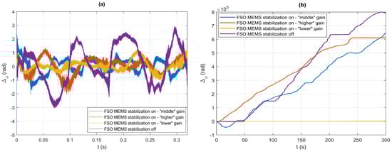 The waveforms of phase deviations over time are shown in Figure 4. In the short-term perspective, where the DC component has been eliminated (a), it is apparent that active optical path stabilization, utilizing MEMS technology, significantly diminishes rapid phase excursions compared to a scenario lacking any stabilization. Over time, the cumulative impact of frequency offsets, frequency drifts, and signal dropouts caused by disturbances (leading to unpredictable outcomes) results in a continuous, long-term phase drift away from the zero value. In this way, the graphical representation in the long-term view (b) compares the overall robustness of all examined MEMS stabilization configurations. It is apparent that in the long-term, the phase deviation of the FSO channel with optimally configured stabilization stays close to zero mean value. At the same time, the other waveforms tend to drift to non-zero values.