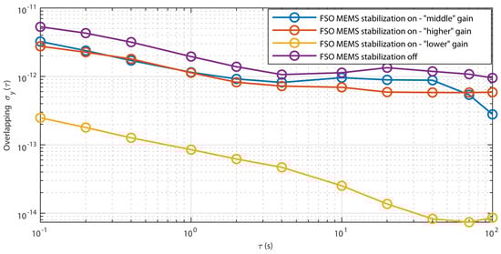 The fractional frequency stability, with respect to the optical frequency of the laser set at 194.734 THz, was determined from the acquired frequency samples. This calculation was performed using overlapping Allan deviations, as depicted in Figure 6. It is evident from the results that a properly configured beam stabilization significantly enhances the fractional frequency stability of the transmission by at least an order of magnitude. The relative stability of a free-running (or improperly configured) FSO transfer is constrained to the higher −13th order of magnitude. However, a properly optimized and stabilized FSO path can achieve fractional frequency stability levels as low as the −14th order of magnitude for integration times exceeding 30 s.