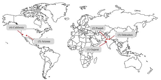 Currently, there are only few Canal-Top solar systems installed in the world (Figure 1). The first applications (2015) were made in India, in the regions of Gujarat and Punjab. Other applications can be found, also in the country, in the Dehradun region. Possible applications have also been studied in the United States, particularly in Arizona and California.