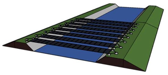 Four (No. 4) strings are shown in the rendering in Figure 4. It should be noted that each string may contain up to three rows of panels with the long side agreeing with the section of the channel or two rows if the panels are arranged in the opposite direction. It is also specified that each string must necessarily include an empty, unused area, since it is affected by shading from the neighboring string.