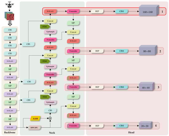 In order to improve the detection ability of the model to deal with tiny and high-density occluded objects, we added an additional prediction head on the basis of the three prediction heads of YOLOv7. This four-head structure, shown in Figure 3, can effectively alleviate the negative impact caused by drastic changes in object scale.