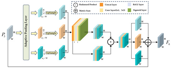 The structure of the AAM is shown in Figure 3. The working process of the AAM can be divided into two parts. The first part is adaptive pooling. (size ) obtains the context features at three different scales (, , ) through the average pooling operation of the adaptive pooling layer. Here, is the pooling coefficient, with a size in the range of , which changes adaptively with a change in the object size. Then, a convolution is used to make the three context features have the same channel dimension, and a scale feature layer is obtained through bilinear interpolation and up-sampling operations, which is convenient for feature fusion in the following steps. In the second part, feature fusion, the layer of the spatial attention mechanism merges context feature channels at different scales, and the merged feature layer obtains the corresponding spatial weight map of the feature layer through the convolution layer, the function activation layer, the convolution layer, and the function activation layer of the spatial attention mechanism in turn. The spatial weight graph and the merged feature graph are separated into three context features through the product operation, and are then summed with to obtain the feature graph with rich context information. AF-FPN can effectively reduce the information loss caused by the reduction of feature channels through the AAM, allowing feature maps with rich context information to be obtained.