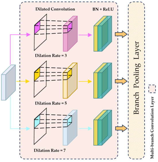 The structure of the FEM is shown in Figure 4. Its working process can also be divided into two parts. The first part is multi-branch convolution. This part includes a dilated convolution layer, a layer, and a function activation layer. The main function of the multi-branch convolution layer is the dilated convolution operation, which can adaptively learn the receptive fields of different sizes in each feature map according to the objects of different scales in the input image, thus improving the detection accuracy of the model for multi-scale objects. The dilated convolution kernels of the three branches are the same size (), while the expansion rate varies . The expansion rate calculation formula is shown in Equations (1) and (2):