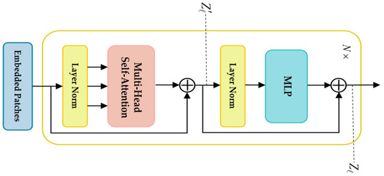 Specifically, in each layer of the encoder, the input sequence of the previous layer normalizes the input of each example on the feature dimension through layer normalization (LN), in order to prevent drastic changes in the value of each layer, thus improving the stability and generalization of the model in terms of feature representation. Then, the output of the previous layer LN passes through the MSA layer to obtain a new sequence . Finally, the output, as a new input, is normalized and submitted to the MLP layer again to generate a set of the latest patch-embedded . Residual links are added between each sub-layer to enable the model to learn the residual function, addressing the problem of gradient disappearance in the processing flow of MSA. MLP is shown in Equations (5) and (6):