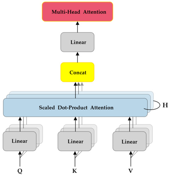 Finally, the output of the self-attention mechanism is cascaded through the head and transformed to the original dimension using linear projection. The final output of the MSA layer is realized through the learnable weight matrix , and the final output is shown in Equation (9):