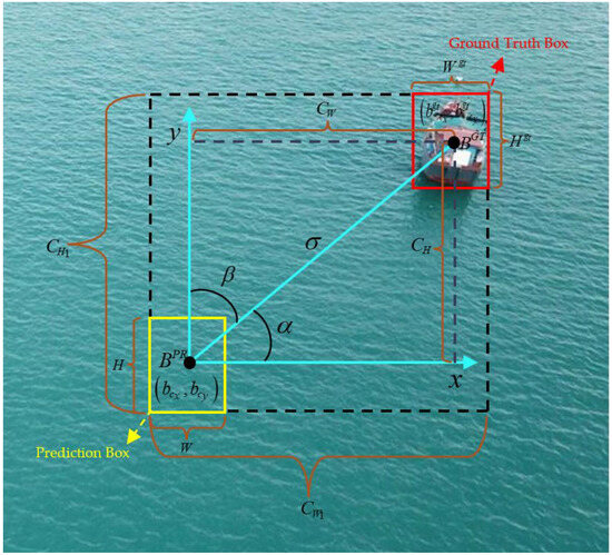 The above four cost parameters determine the main functions of SIoU and are re-defined by SIoU. The parameter relationship of SIoU is shown in Figure 8. The definitions of the various parameters are as follows: First, for the angle cost , its definitions are shown in Equations (16)–(19):