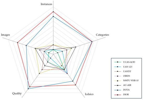 We selected several standard aerial image data sets, including DIOR, DOTA, UCAS-AOD, U-AIR [59], UAV-123 [60], UAVDT [61], NWPU VHR-10 [62], and OIRDS [63], and collected statistics on the data sets in the following five aspects: images, categories, instances, quality, and intra-class differences and inter-class similarities (Icdaics). The results are shown in Figure 10.