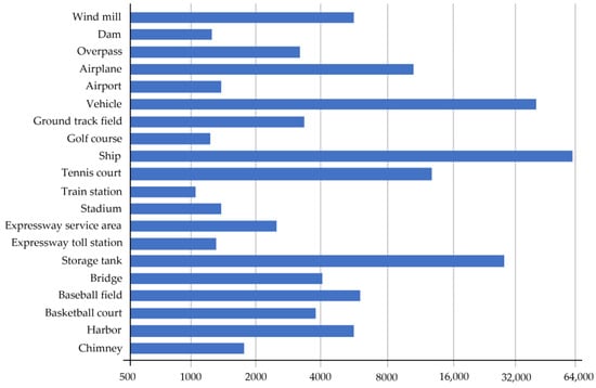 - The types of objects are comprehensive, and there may be many types of objects in aerial images. On one hand, in terms of the object scale, large, medium, and small objects will exist in the image; on the other hand, in terms of object types, aerial objects are varied, including objects such as ships, courts, cars, bridges, and so on. The consideration of comprehensive object types is conducive to training an efficient detection model.