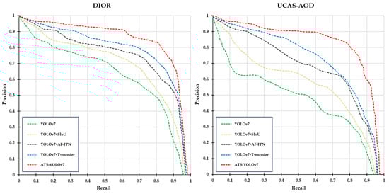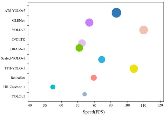 As each network did not use the images in the DIOR validation set during training, we selected some images from the validation set for experiments, in order to make the experimental results more consistent with a real scenario. It can be seen, from the figure, that ATS-YOLOv7, YOLOv7, and TPH-YOLOv5 were the fastest in terms of reasoning speed, reaching 94 fps, 110 fps, and 105 fps, respectively. This result indicates that these three models had the highest speed advantage for the objects in the validation set. However, in terms of accuracy (see Table 6), ATS-YOLOv7 reached 87%, 5% higher than YOLOv7. As for the reasoning speed of ATS-YOLOv7, although presented no advantage over YOLOv7 and ATS-YOLOv7, it had little difference in comparison with them. As the object detection task of an UAV aerial image is an application project, we should consider the reasoning speed and detection accuracy comprehensively when exploring the real-time nature of the model, seeking a balance between the two. Based on this, from a comprehensive point of view, ATS-YOLOv7 has both accuracy and speed advantages and, so, is the most applicable model among these models.