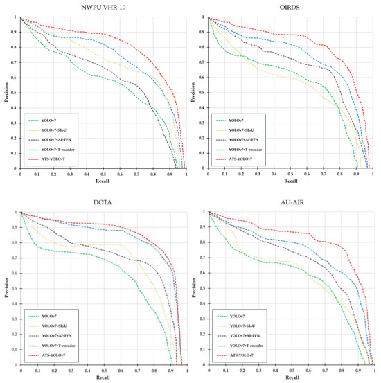 From the experimental results, it can be seen that the detection results of the various models for large- and medium-sized objects were generally higher than those for small and tiny objects, indicating that small and tiny objects are extremely challenging in the field of object detection. Our proposed model, ATS-YOLOv7, presented the best overall performance among various visual models (mAP of 87%, F1 score overall higher than other models), being especially superior to other models for small and tiny objects. Specifically, the 10 models had high detection results for large- and medium-sized objects, such as stadiums, bridges, sports fields, airports, and so on. Among them, GLENet obtained the best results (mAP of 90%), 26% higher than the worst YOLOv5 model. The difference between ATS-YOLOv7 and the best-performing model was only 0.4%, indicating that the method proposed in this article also has efficient performance for large- and medium-sized objects. However, for small and tiny objects, such as cars, ships, and chimneys, ATS-YOLOv7 presented the highest score compared to other models, being 4.9% higher in accuracy than the second scoring model YOLOv7. These results demonstrate that our proposed AF-FPN module, T-encoder module, and SIoU can efficiently enhance the detection of medium and large objects by improving upon YOLOv7, and that the proposed model demonstrates superior performance when considering tiny and challenging objects in UAV aerial images.