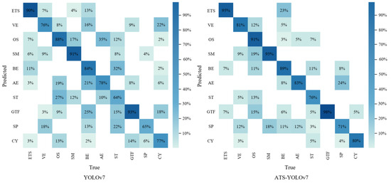 During model training, the AdamW optimizer was used to train ATS-YOLOv7. Considering the memory limitations of the experimental platform, the initialization parameters were set as follows. The cosine annealing strategy was used to update the learning rate, the weight decay regularization parameter was 0.0005, and the momentum was 0.937. The specific parameter settings used during training are given in Table 2.