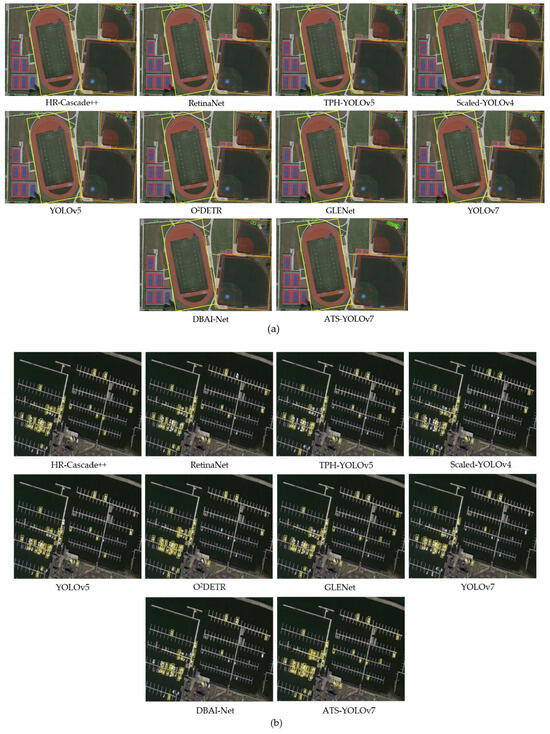 Figure 14a shows the results of each model for multi-scale targets in a large scene. The objects in the picture are a ground track field, a basketball court, a tennis court, a golf course, and a car. Their dimensions vary from large to small, and their positions are scattered. It can be seen from the figure that ATS-YOLOv7 had the fewest misdetected objects, while HR-Cascade++ had the most misdetected objects, and the rest of the models had varying degrees of misdetection. This can be explained by the adaptive feature enhancement network, AF-FPN, of ATS-YOLOv7 helping the network reduce the negative impact on the network when multiple objects at varying scales change violently in large scenes, helping the detection performance of the network to remain stable.