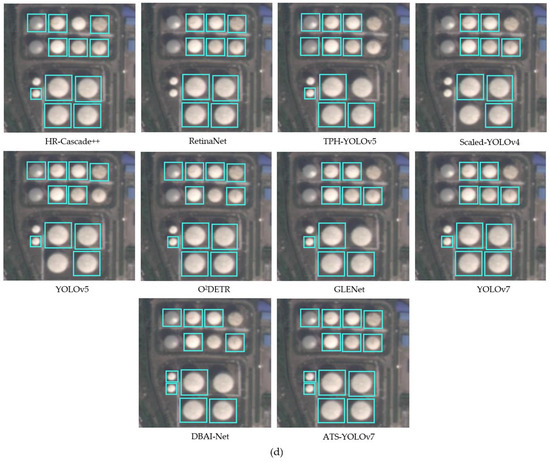 Figure 14d shows the results of each model for storage tank targets with a fuzzy background. It can be seen that ATS-YOLOv7 detected and recognized storage tanks in fuzzy states better than the other models, as a result of the self-attention mechanism and adaptive feature strengthening mechanism in ATS-YOLOv7. However, in this state, if the storage tank is similar to the background, ATS-YOLOv7—like most other models—had trouble detecting the storage tank. In the future, we hope to further study TPH-YOLOv5 to improve our model architecture in this regard.