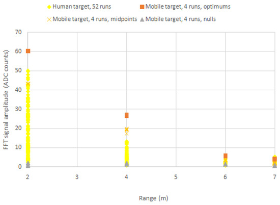 The resulting data for both the mobile and human target are plotted as amplitude of the corresponding FFT peak vs. target distance, as shown in
