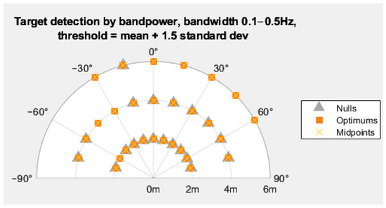 14]. The algorithm then calculates the bandpower in the same bandwidth for the moving-target data. Detection is considered successful if the moving-target bandpower exceeds the threshold value. A polar plot showing the detection results for the DUT at various range and angle combinations is shown in