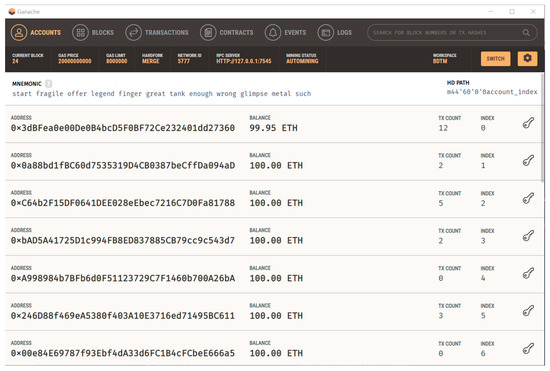 We built an Ethereum private chain using Ganache, and Figure 4 shows that we created 20 accounts and allocated 100 ETH per account for testing.