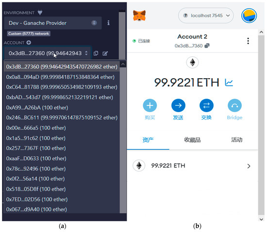 (a) The account used for contract testing. (b) Metamask connects to the local IP and manages the account.
