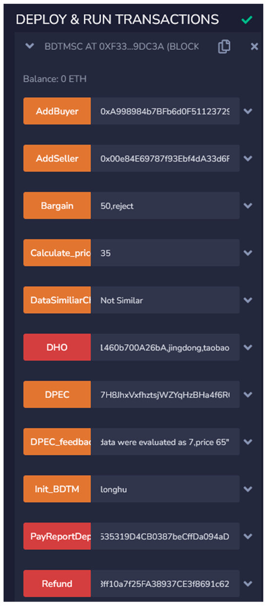 The function shown in Figure 6 is the main functional function needed to realize the whole BDTM system. The function shown in yellow requires the user to fill in the required parameter value when calling. The function shown in red not only requires the user to fill in the required parameter value when calling, but also has the function of ether transaction function, which needs to be carefully operated when calling, and the ether transfer operation is irreversible once completed.