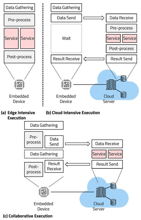 Cloud computing, as shown in Figure 1b, serves as a method to compensate for the low computational performance of embedded devices. In the cloud-intensive computing approach, all data gathered from the embedded device are transmitted to the cloud server for processing and then relayed back to the embedded device. As all computations are carried out in the cloud, computation times are quicker than edge-intensive execution. However, additional time is required for data transmission. Furthermore, when an embedded device requests the server to execute an operation, the processor remains idle until the result is returned, leading to decreased resource utilization. Due to communication overhead, cloud-intensive execution exhibits faster speeds than edge-intensive execution when executing applications that necessitate more computation relative to data transfer.