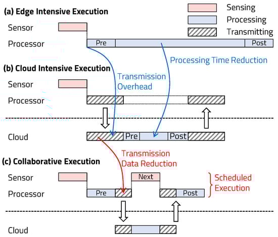 Collaborative execution involves preprocessing data detected by sensors and then transmitting processed data to the cloud in bursts. Although preprocessing collaborative execution takes longer than cloud-intensive execution, it can reduce the amount of data to be transmitted. We outline the communication layer based on collaborative execution, enabling concurrent processing that can collect the next data while maintaining the communication channel, as shown in Figure 2c. This approach allows for more efficient use of resources and potentially faster overall execution times.