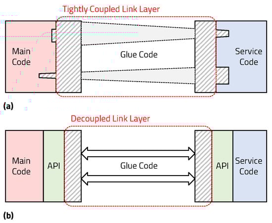 We consider the communication layer to enhance the flexibility and scalability of services provided by the server–client system. Figure 3 shows the concept of the connection structure of the server–client system; Figure 3a represents the existing static linking approach. In the existing method, the connection layer between service codes is tightly coupled to the main code running on the edge and the service code running on the server. Due to the tightly coupled structure, the main code, service code, and glue code are designed as a single structure, and to modify one, all codes must be relinked. Figure 3b shows the proposed on-cloud linking-based approach. The existing link layer designs the glue code, considering the code to be connected, but in the proposed approach, the link layer is designed considering only the API. The API is a protocol for abstracting the link layer. The main code and service code designed by user use the API for communication, and the communication glue code between APIs is created by the communication layer generator.