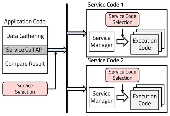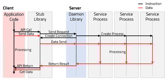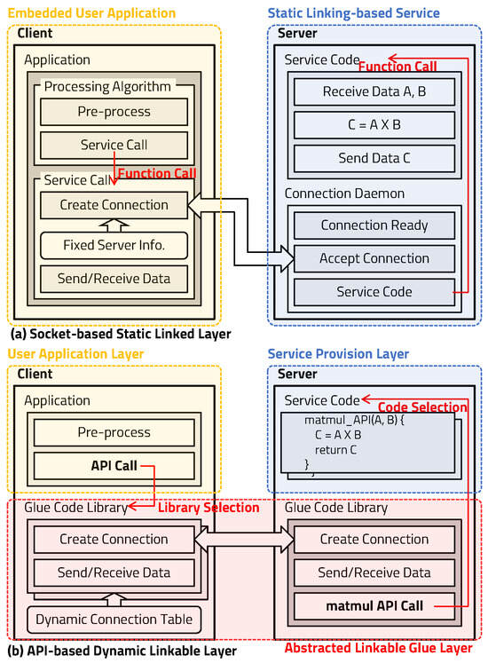 Figure 4a shows the program structure, which is based on the existing socket-based static link layer structure. In the edge–cloud system, the embedded user application and the cloud service code are implemented with full awareness of each other. The user application that runs on the client is composed of an application part for processing data and a service call part for communication with the server. The client first preprocesses the data collected from the sensor, and then establishes a connection between the server and itself. The connection function is implemented by including the server’s location information, which is predetermined by the user, into the client’s application. The daemon running on the server is also designed with knowledge of the edge’s system information. When the client request occurs, the daemon executes a fixed service code. The existing edge cloud structure requires mutual knowledge of each other’s existence and necessitates the development of communication programs; thus, existing programs can only provide fixed services, limiting their flexibility.