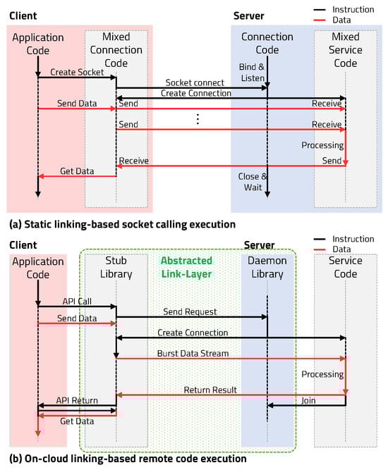 Remote code execution virtualizes a server’s resources, enabling the program running at the edge to utilize the server’s resources as if they were local. Figure 6a shows the hierarchical execution flow of the existing socket-based server–client program, while Figure 6b shows the hierarchical execution flow of the proposed on-cloud linking-based server–client program. In the socket-based program, the server opens a port and waits for the socket connection to receive requests from the client. The edge device connects a socket to the server using the server’s IP and port number. Through the connected socket, the client transmits data to the server, and the server returns the results of the computed data to the client. Socket-based communication requires developers to synchronize the sequence for sending and receiving data between the server and client at the code level, necessitating the joint design of service code and application code.