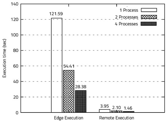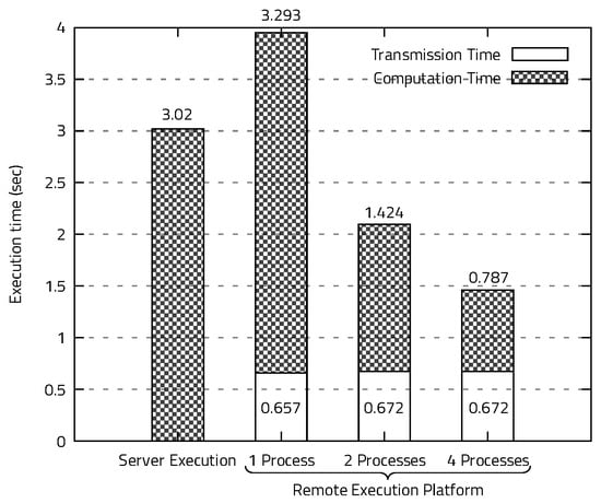 Figure 9 shows the time taken for data preparation and transfer when the program was run on the remote parallel processing platform, and the time when the computation was actually performed on the server. The communication time required to prepare data at the edge of the parallel processing platform and transmit the data to the server was on average 0.67 s, regardless of which service is running. When executing the program in a server environment that does not use the proposed platform, the total execution time is 3.02 s. When the program is executed using the remote execution on the proposed platform, the request managing time is added at , as shown in Equation (3), so the computation time increases to 3.293 s and the execution time, including the data transfer time, is 3.95 s. However, in services that use multiple processes, the data transfer time and remote code request managing time are the same, but the matrix multiplication time is inversely proportional to the number of processes N.