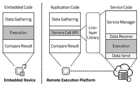 Our previous work introduced an on-demand remote execution-based cloud execution platform to virtualize the server’s memory and accelerator resources. Using on-demand remote execution, the edge device executes services on the servers as if calling a function from the main program on the edge device. With on-demand remote code execution, on-chip flash memory is virtualized and the service code is streamed to the edge in real time [12,13,14]. The executing service code is located on the server; thus, on-demand remote code execution can perform operations that are not built into the edge device. Furthermore, it allows the edge device to utilize the abundant resources of the cloud server in the background.