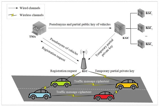 Figure 1 describes the system model of our LS-MRCLSC scheme. There are four entities equipped in vehicles: the TMA, KGC, RSUs, and OBUs. The upper layer is composed of the TMA and KGC, which communicate over the wired channels. The lower layer consists of RSUs and vehicles, which communicate over the wireless channels.