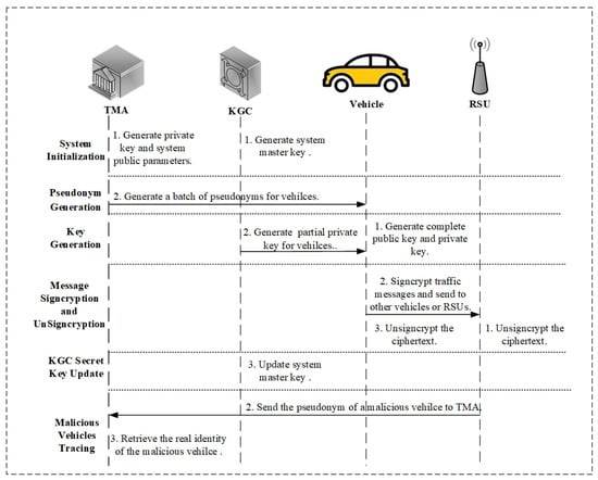 In the system initialization stage, the TMA and KGC generate their own private keys and system public parameters. In the pseudonym generation stage, vehicle registration is accomplished through the TMA. In the key generation stage, vehicles compute complete public and private keys with the help of . In the message signcryption and unsigncryption stage, the sender vehicle signcrypts the messages and sends the ciphertext to other vehicles or RSUs. Then, the receiver vehicles or RSUs unsigncrypt the ciphertext to obtain the traffic-related information. In the KGC secret key update stage, update their own sub-keys and SMKs by executing the FVSS algorithm. In the malicious vehicle tracing stage, the TMA retrieves the real identities of malicious vehicles and punishes them.