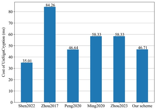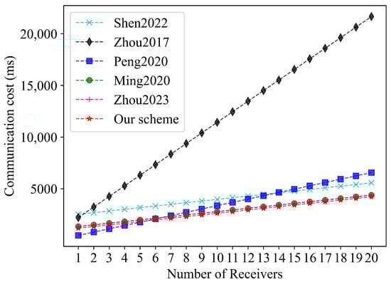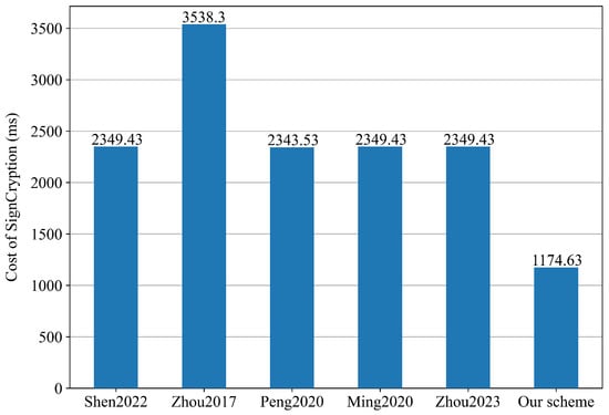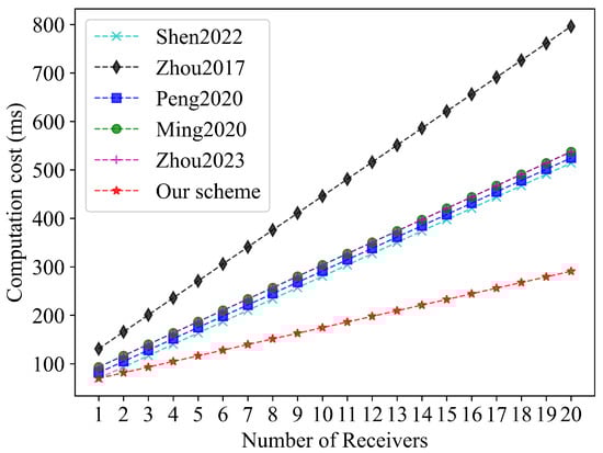 - The LS-MRCLSC scheme effectively reduces the computation cost and communication overhead. Both theoretical analysis and simulation experiments demonstrate that the LS-MRCLSC scheme is efficient in terms of computation cost and communication overhead. Specifically, when there are 100 receivers, the total computation time (signcryption and unsigncryption) of the LS-MRCLSC scheme is reduced by 48.77%, 66.28%, 48.90%, 49.27%, and 49.27%, respectively, compared to the schemes in [7,8,9,10,11]. In addition, the communication overhead is reduced by 7.32%, 83.57%, 47.06%, 0.93%, and 0.93%, respectively, compared to the schemes in [7,8,9,10,11].