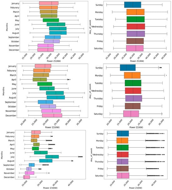 Figure 2 illustrates the power consumption of the three zones by looking at the month and day of a week. For Zone 1 and 2, the power consumption is at its peak in August, while Zone 3 July is the month of power’s highest demand. Also, the month boxplot of Zone 3 showed many outliers with high power consumption in February, March, April, May, July, August, September, October, and November. Such abnormal power consumption is also reflected in the Day boxplot subfigure. In general, the power consumption during the weekdays is almost similar. However, in Zone 1 and 2, the power consumption is a little less during Sundays.