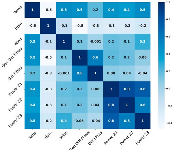 Pearson’s correlation coefficient, denoted as RHO, measures the strength and direction of linear relationships between two variables. It ranges from −1 (perfect negative correlation) to +1 (perfect positive correlation), with 0 indicating no linear relationship. When applied to evaluate relationships between independent and dependent variables, RHO helps identify which independent variables are more strongly associated with the dependent variables in a linear manner. The analysis conducted in our study is illustrated in Figure 3. The Temperature variable exhibited the highest correlation when compared to other independent variables, with correlation coefficient values of 0.44, 0.39, and 0.49 in relation to the three target variables (Power Consumption_Zone1, Power Consumption_Zone2, and Power Consumption_Zone3). On the other hand, the Humidity variable showed comparable correlation coefficient values to the three targets, ranging from −0.23 to −0.29, suggesting a moderate negative linear relationship. In contrast, the Wind Speed and General Diffuse Flows variables demonstrated low correlation coefficient values, with the Diffuse Flows variable exhibiting nearly no correlation with the three target variables. These findings provide valuable insights into which independent variables have the most substantial linear impact on the dependent variables, aiding in model selection and interpretation.