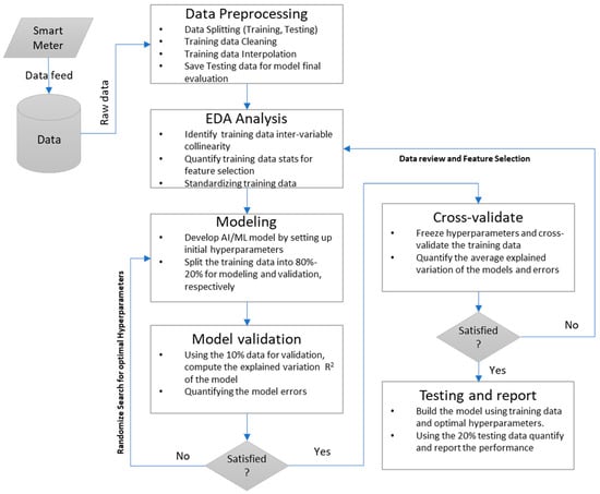 The recent surge in ML and DL models has brought forth sophisticated tools capable of unraveling complex patterns and dependencies in electricity consumption. The advanced ML and DL models showcased excellence in handling non-linear relationships and long-term dependencies, making them particularly suitable for precise energy forecasting within building contexts [40]. The hybrid models, amalgamating multiple forecasting techniques, present a promising avenue by leveraging the unique strengths of different algorithms to enhance the accuracy of predictions [41,42]. The effectiveness of ML and DL models crucially relies on feature engineering techniques. These techniques involve extracting relevant information from data to ensure that the models can discern and capture the key factors influencing electricity consumption. The application of such techniques not only facilitates improved energy management decisions but also contributes to grid stability and supports the integration of distributed generation [43,44]. The continuous evolution and progress in this field contribute to the generation of precise and timely forecasts, thereby aiding in effective energy planning and optimization. In a specific study [45], a novel approach is proposed, utilizing generative adversarial networks (GAN) to generate parallel energy consumption data. These generated data are then combined with the original dataset to enhance the performance of energy consumption prediction. The evaluation of the proposed method involves metrics such as the mean absolute error (MAE), mean absolute percentage error (MAPE), and Pearson correlation coefficient. Another study [22] puts forth a method that integrates convolutional neural network (CNN) and long short-term memory (LSTM) for the prediction of electric charges. The performance of this approach is compared with other models, including LSTM, XGBoost, and radial basis functional network (RBFN), using metrics such as RMSE, MAPE, MAE, and goodness of fit (R2). Taking a different approach [46], a non-parametric regression model is introduced, utilizing Gaussian process (GP) for the selection of input data to predict electricity consumption in buildings. The study evaluates the effectiveness of support vector regression (SVR), LSTM, and random forest (RF) through metrics such as symmetric mean absolute percentage error (sMAPE), MAE, and RMSE. Various models and metrics have conducted extensive analyses to predict energy consumption [47,48,49,50]. These studies involve evaluating the performance of models like random forest (RF), support vector regression (SVR), multilayer perceptron (MLP), and others. The metrics employed in these evaluations include the mean absolute percentage error (MAPE), R2, RMSE, and more. A comprehensive summary of the most recent related work is presented in Table 1.