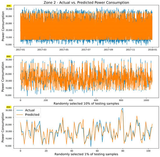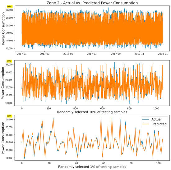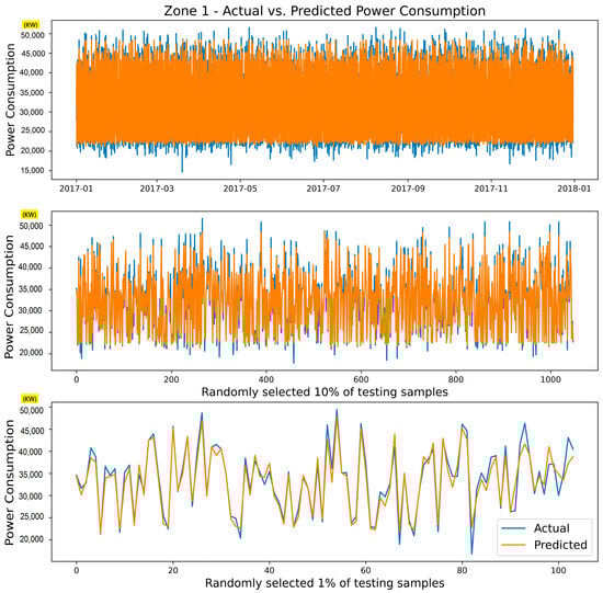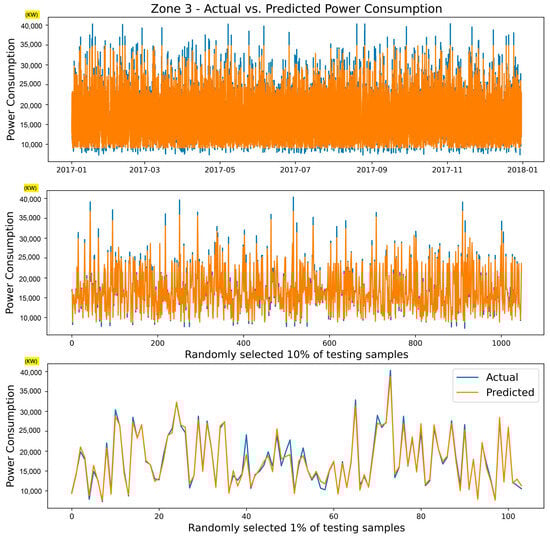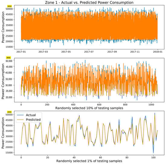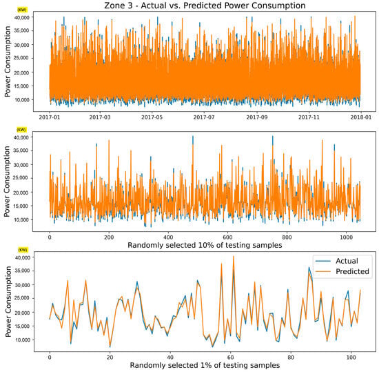 Figure 5, Figure 6 and Figure 7 present distinct figures, each encapsulating the outcomes derived from our proposed DL model in the context of Power Consumption prediction for three distinct zones, as specified within our dataset. These figures collectively provide an intricate analysis of our DL model’s predictive capabilities, offering valuable insights into its performance across different zones and sample sizes. Each figure consists of three subfigures: (top) comprehensively illustrates the results encompassing all testing samples, offering a holistic view of the model’s performance over time, (middle) selectively focuses on a subset, specifically 10% of the testing samples, enabling a more detailed examination of predicted and actual data points, and (bottom) narrows the scope further, emphasizing only 1% of the testing samples. This deliberate reduction in sample size enhances the visual clarity of the plots, facilitating a meticulous assessment of the alignment between predicted and actual data points.
