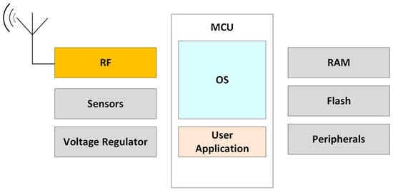 Radio frequency fingerprinting (RFF), being a noncryptographic method, has been in use for a few decades now. However, its potential as a physical layer security feature in wireless sensor networks of IoT has been gaining popularity recently [15,16]. RFF uses hardware impairments in the radio section of an IoT device for classification. These impairments are unique to each IoT device due to inherent nonlinearities in the manufacturing process of these inexpensive devices. The components of an IoT device are shown in Figure 2. It is imperative to point out that the aim of most studies on RFF has been device authentication at the physical layer—threat elimination at the first line of defense.